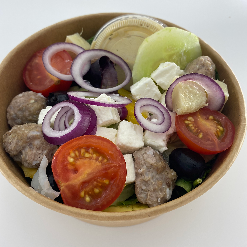 Salade composée concombre, olives noire, pâtes grecque, tomates cerise, kefta d’agneau, origan, fêta, sauce blanche