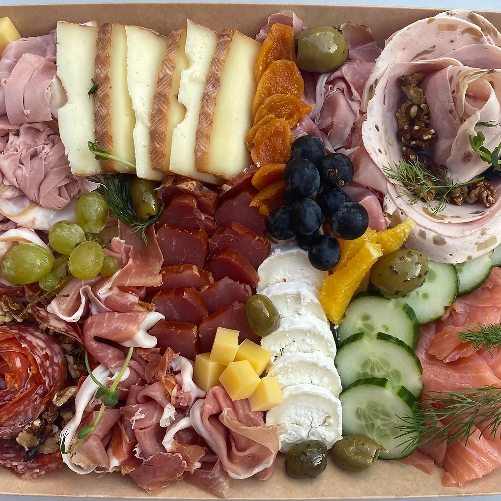 🍇 Dans ce plateau, on a glissé des raisins, des oranges, et même du concombre pour vous rappeler que la vie peut être saine et gourmande en même temps. On a ajouté une touche « healthy » avec des abricots séchés, des olives et des noix, parce qu’après tout, on aime les choses équilibrées !